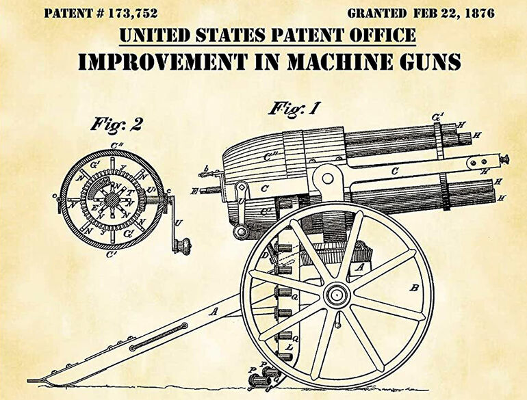 Но речь в заметке пойдет не об этой задорной революционной песенке из фильма "Армия трясогузки", а о вещах, куда более ранних. 150 лет назад, в начале 1876 года, была запатентована и прошла испытания весьма интересная, но почти неизвестная даже знатокам оружия штуковина, а именно — так называемый пулемет Бэйли. Чертеж общего вида из его патента и поперечный разрез казенной части помещены вверху.