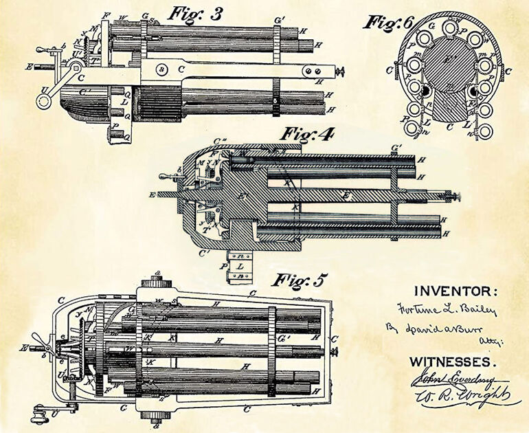 Все знают, что у первого пулемета Хайрама Максима патроны вставлялись в ячейки холщовой ленты и что с тех пор ленточное питание применяется почти на всех станковых и на многих ручных пулеметах. Однако мало кто знает, что патронную ленту придумал не Максим, а другой американский изобретатель Форчун Бэйли еще в 1874 году, то есть, за 9 лет до того как Максим запатентовал первый образец своего оружия.