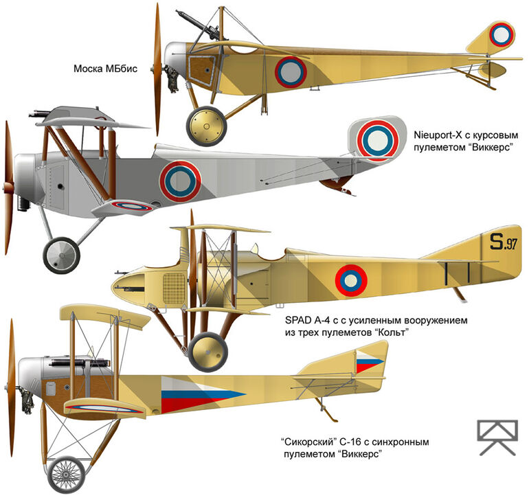 Далее — небольшая подборка моих рисунков и архивных фотографий боевых аэропланов, на которых сражались первые российские летчики-истребители.