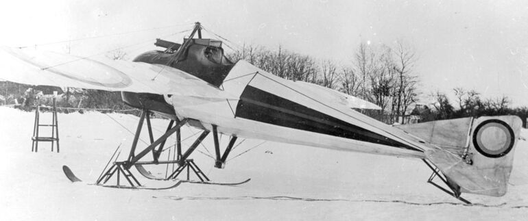 Morane-I, он же "Моран-монокок" с синхронным пулеметом "Виккерс" на лыжном шасси.