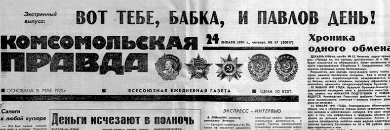 22 января 1991 года в 21.00 в программе «Время» прозвучал Указ Горбачёва об изъятии купюр достоинством в 50 и 100 рублей из обращения и заменой их на купюры нового образца. Для обмена предполагалась сумма не более 1000 рублей (остальные деньги пропадали) и было отведено только три дня со среды 23 января по пятницу 25 января
