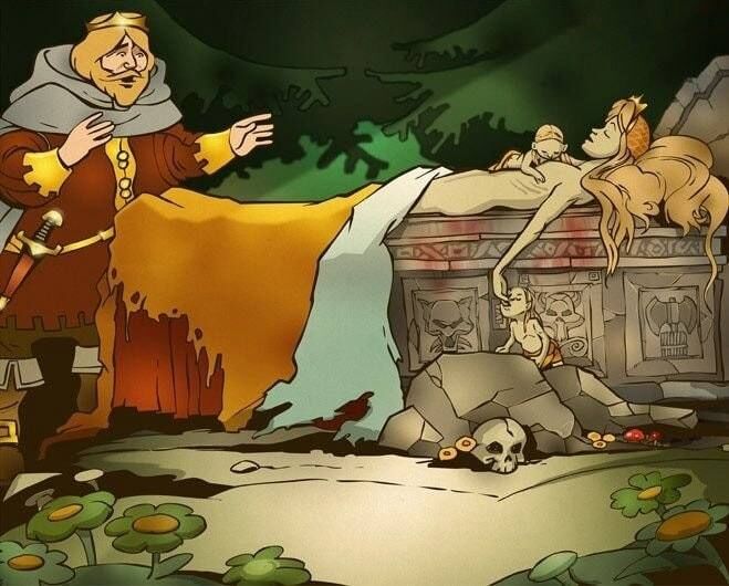 Король, полюбовавшись на юную голую красавицу, привязанную к столбу, решил, что прикольнее будет отправить на костёр старую жену. А детей, оказывается, спас повар.