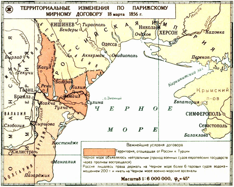 Она не только возвратила Турции все территории и крепости, завоеванные в Закавказье, но и отдала ей Южную Бессарабию с многострадальным Измаилом, который русские солдаты брали в общем счете шесть раз, но потом каждый раз были вынуждены оттуда уходить. Кроме того, России пришлось отказаться от военного флота на Черном море, а также — уничтожить все черноморские крепости, то есть, фактически — сделать открытыми и беззащитными свои южные рубежи.
