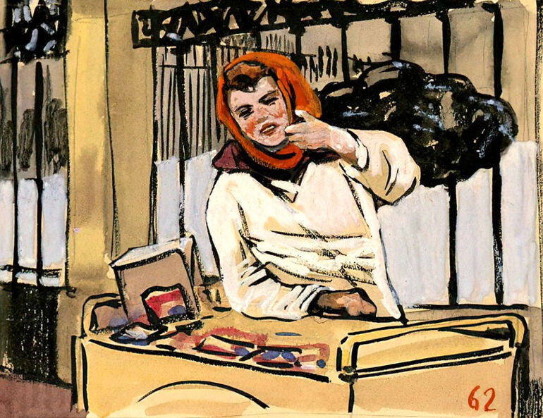 Дмитрий Иванович Пяткин (1921–1999): «Продавщица мороженого»; бумага, гуашь, тушь, белила