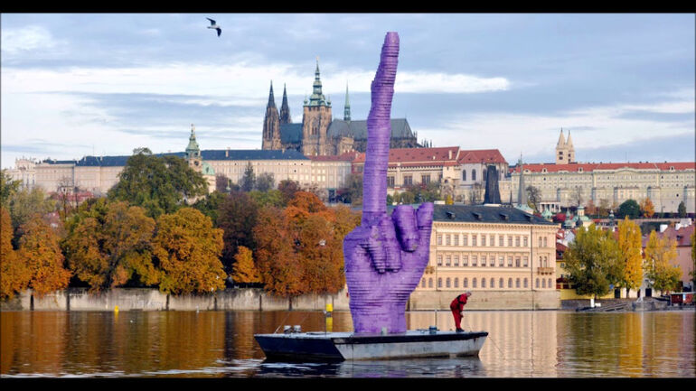 Десятиметровая пурпурная рука, показывающая средний палец, направлена прямо в сторону Пражского Града — резиденции президента Чехии, сделана из стекловолокна и установлена на плавучей платформе.