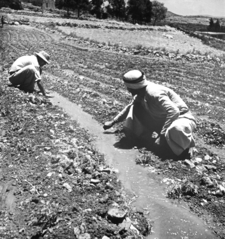 1948. Израиль. Арабский рабочий помогает с поливом поля, Галилея