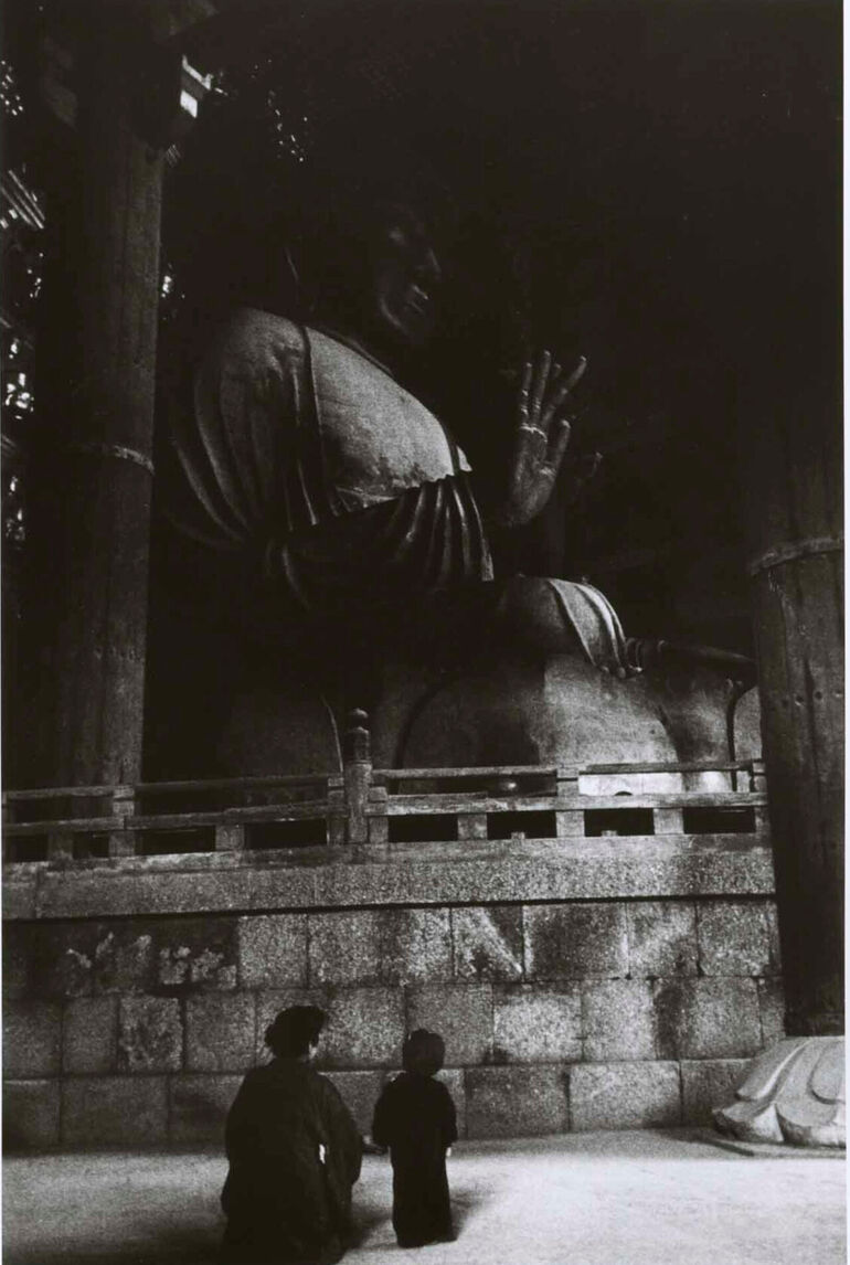 1954. Взрослый и ребёнок сидят рядом с гигантской буддийской статуей, Нара, Япония, апрель