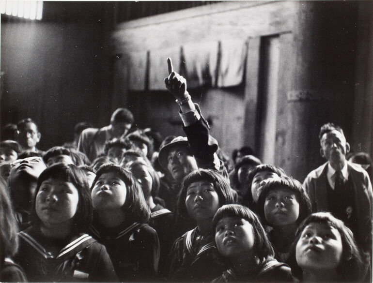 1954. Дети в школьной форме смотрят вверх, следуя совету мужчины, Нара, Япония