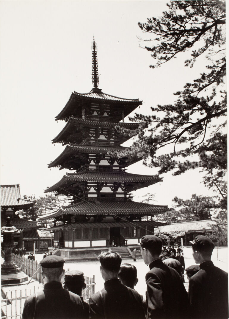 1954. Люди стоят перед пагодой буддийского храма, Тодай-дзи, Нара, Япония