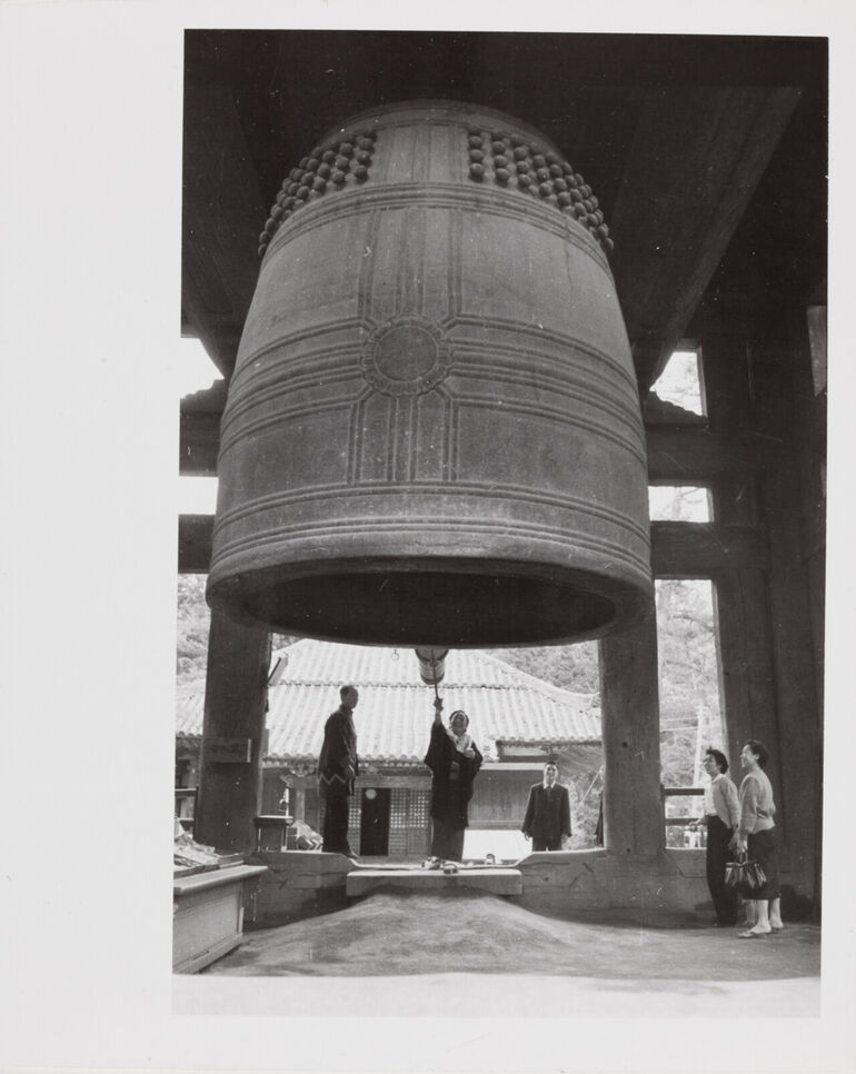 1954. Мужчина звонит в бронзовый колокол в буддийском храме Тодай-дзи, Нара, Япония, апрель
