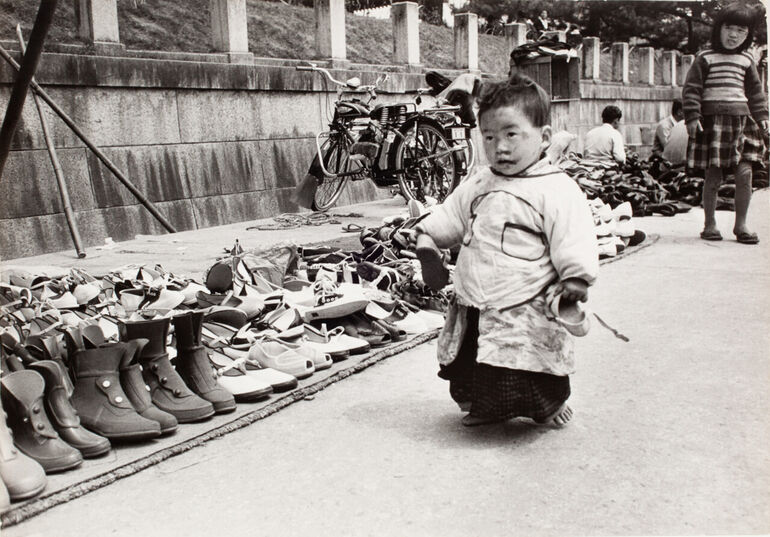 1954. Ребёнок держит обувь и идёт босиком по улице, Нара, Япония, апрель