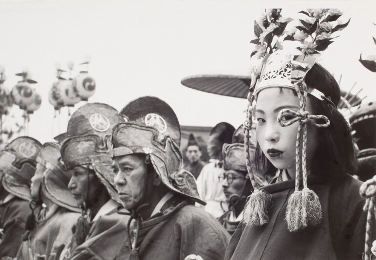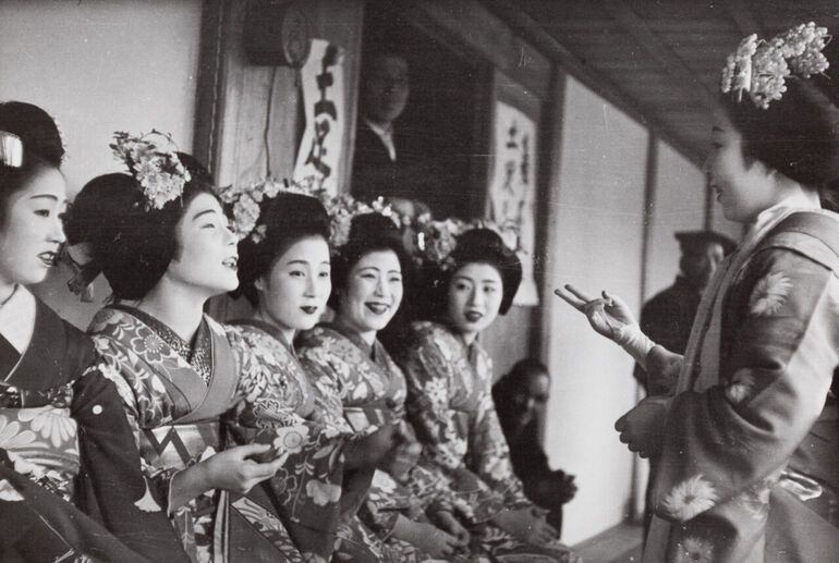 1954. Гейша в традиционном костюме выступает на сцене с музыкантами, Киото