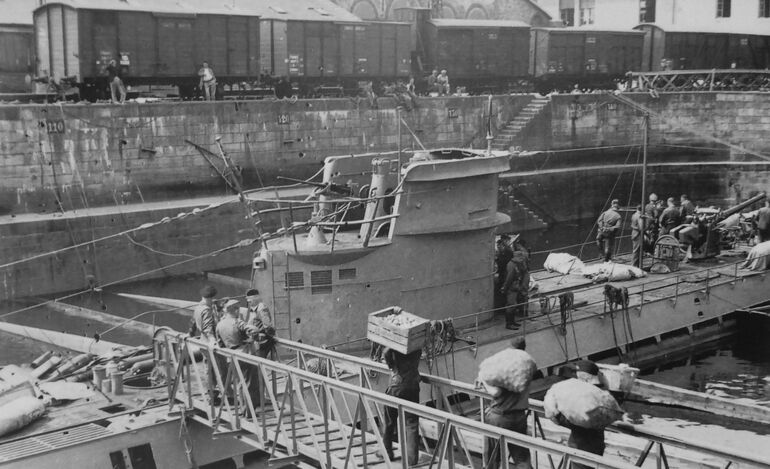 1940. Загрузка продовольствия на немецкую подводную лодку U-43 (тип IX A) в порту Лорьяна
