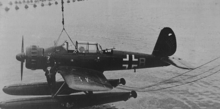 1940. Гидросамолет Арадо Ar 196, поднимаемый краном на борт немецкого тяжелого крейсера «Принц Ойген»