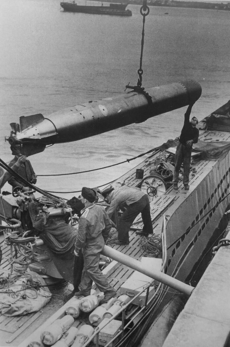 1940. Загрузка торпеды на немецкую подводную лодку типа VII в Лорьяне (Lorient) на базе подводных лодок Кригсмарине.