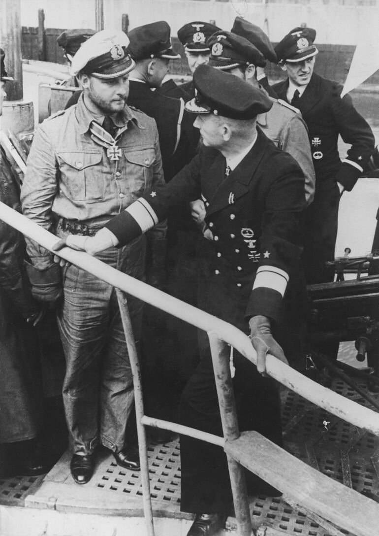 1940. Сентябрь. Капитан-лейтенант Фриц-Юлиус Лемп и контр-адмирал Карл Дёниц на мостике подлодки U-30