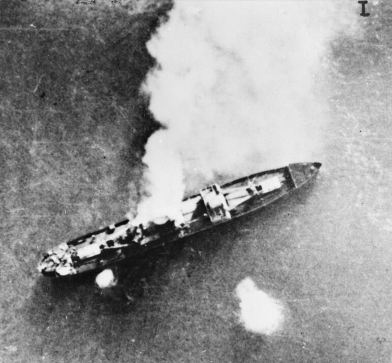 1941. 06.06. Немецкий блокадопрорыватель «Эльбе» горит после атаки британской палубной авиации