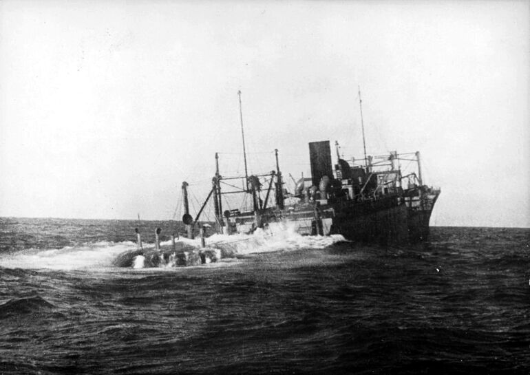 1940. 13.03. Торпедированный немецкой подлодкой U-28 голландский танкер «Эулота» уходит под воду