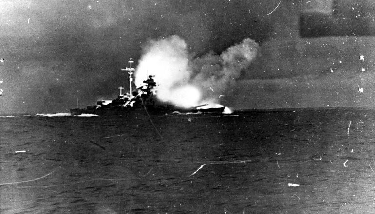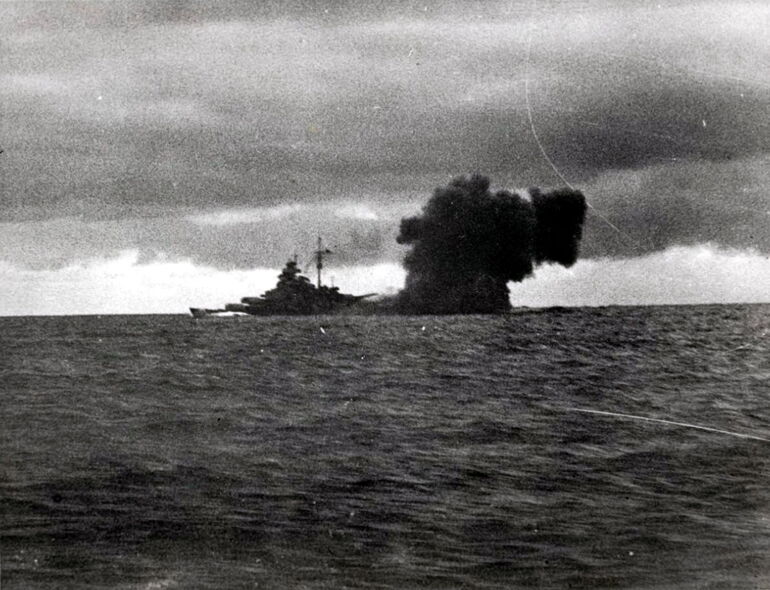 1941. 24.05. Немецкий линкор «Бисмарк» стреляет по британскому линкору «Принс оф Уэйлс» во время боя в Датском проливе
