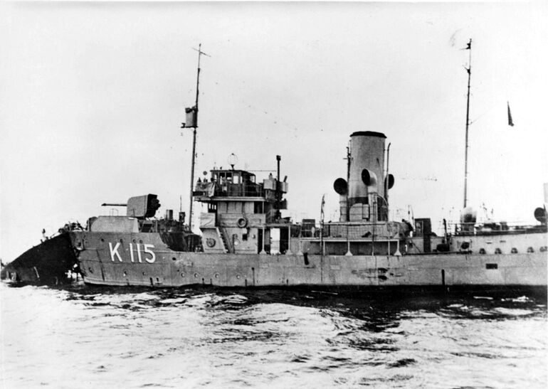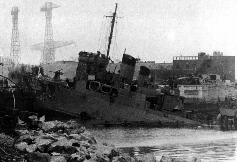 1942. 28.03. Немецкие военнослужащие осматривают врезавшийся в ворота сухого дока Луи Жубер Лок в Сен-Назере британский эсминец «Кэмпбелтаун», использовавшийся в качестве мины замедленного действия для подрыва дока