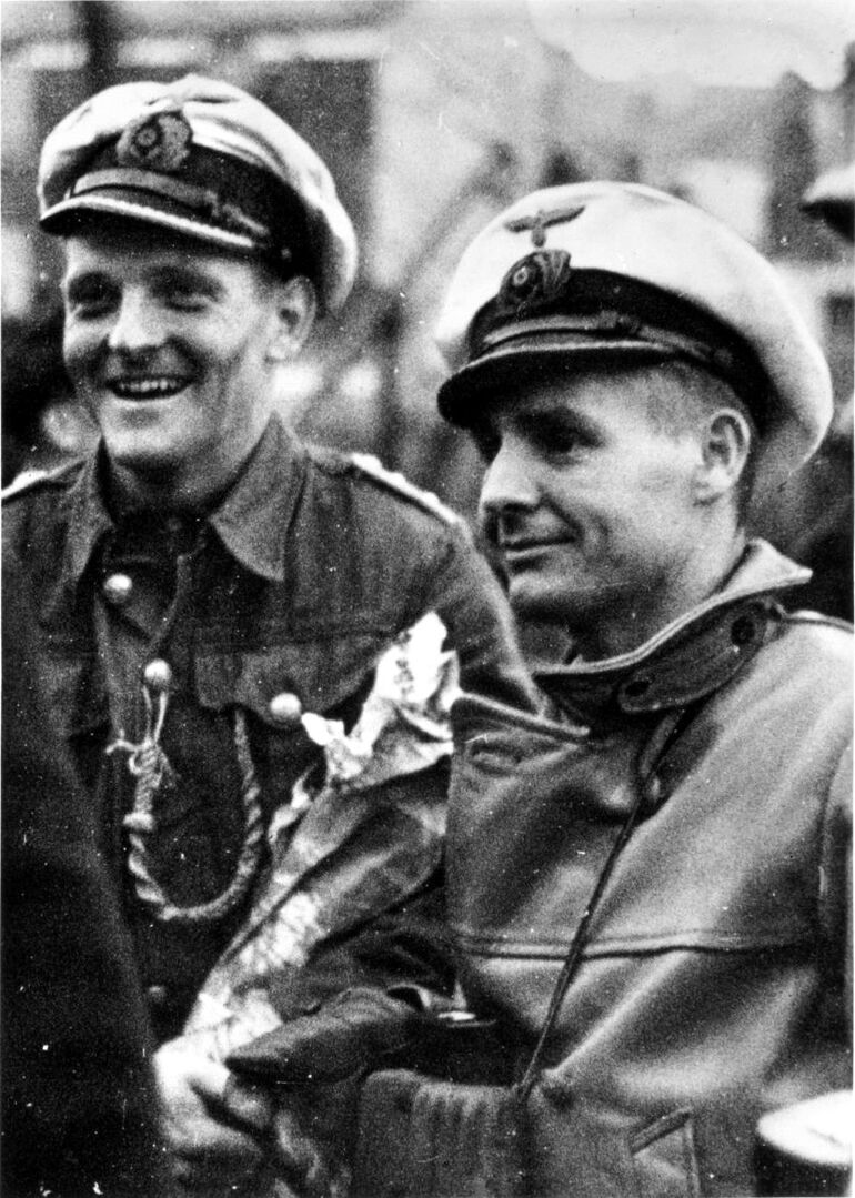 1941. 25.10. Командиры подводной лодки U-552 капитан-лейтенант Эрих Топп (1914—2005) и командир немецкой подводной лодки U-567 капитан-лейтенант Энгельберт Эндрасс (1911—1941) во французском порту Сен-Назер перед выходом в боевой поход