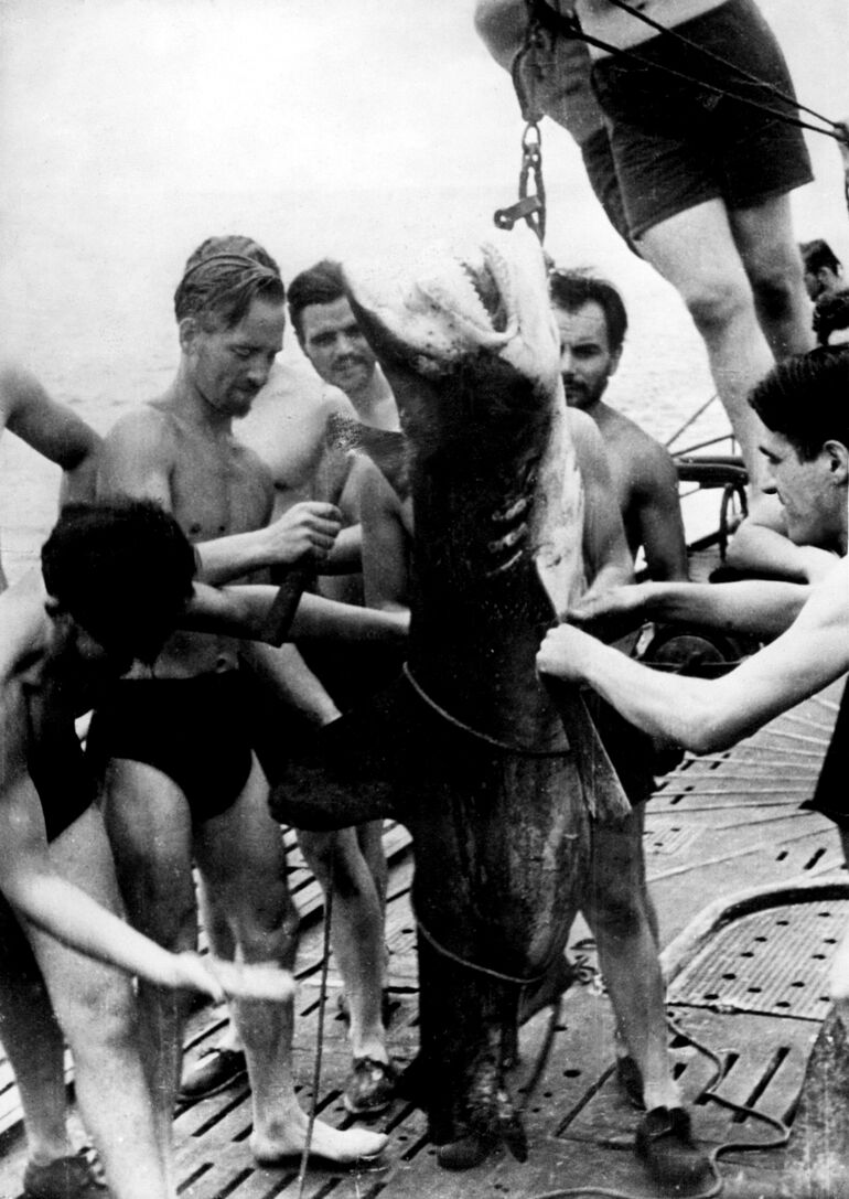 1942. 27.01. Немецкие подводники разделывают пойманную акулу