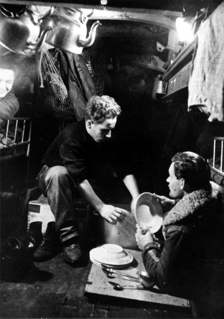 1942. Матросы немецкой подводной лодки моют посуду в отсеке