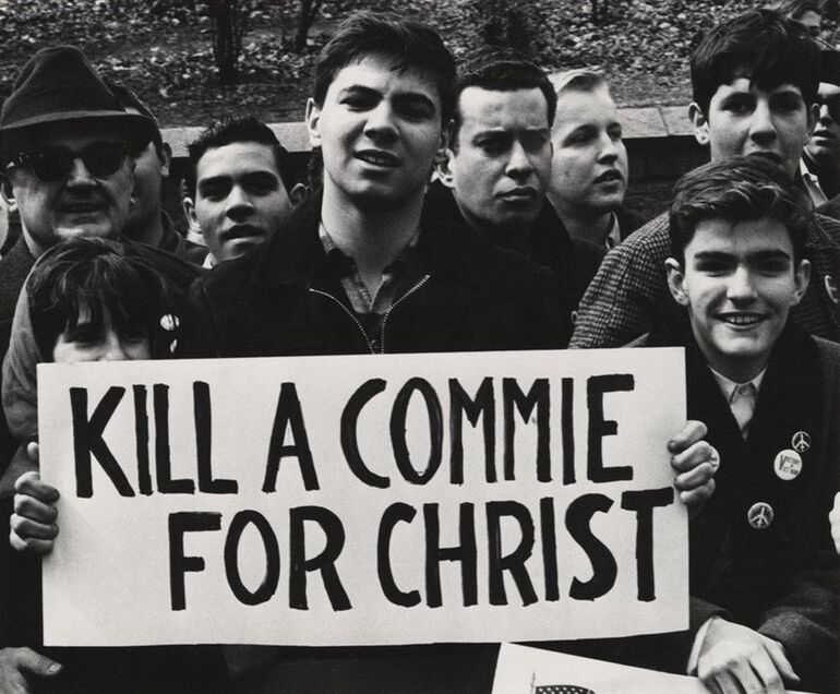 1966. Демонстрант, выступающий в поддержку войны во Вьетнаме, держит плакат «Убей комми ради Христа»