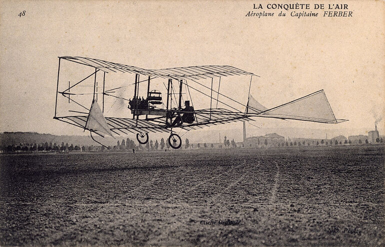Французская почтовая открытка с фотографией полета Фербера. Его аэроплан с каркасом из бамбука имел велосипедное шасси с дополнительными боковыми опорами, установленный спереди руль высоты и два треугольных руля поворота на концах нижнего крыла.
