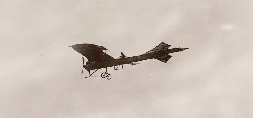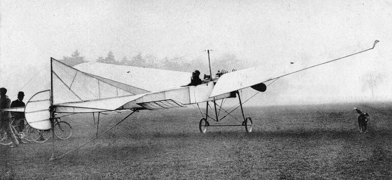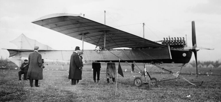 Исторический снимок самолета "Антуанетт VII" с 16-цилиндровым мотором и профилированным деревянным винтом. На этой машине летчик Юбер Латам 7 января 1910 года установил мировой рекорд высоты, поднявшись на 1100 метров и впервые в истории преодолев километровый рубеж на летательном аппарате тяжелее воздуха.