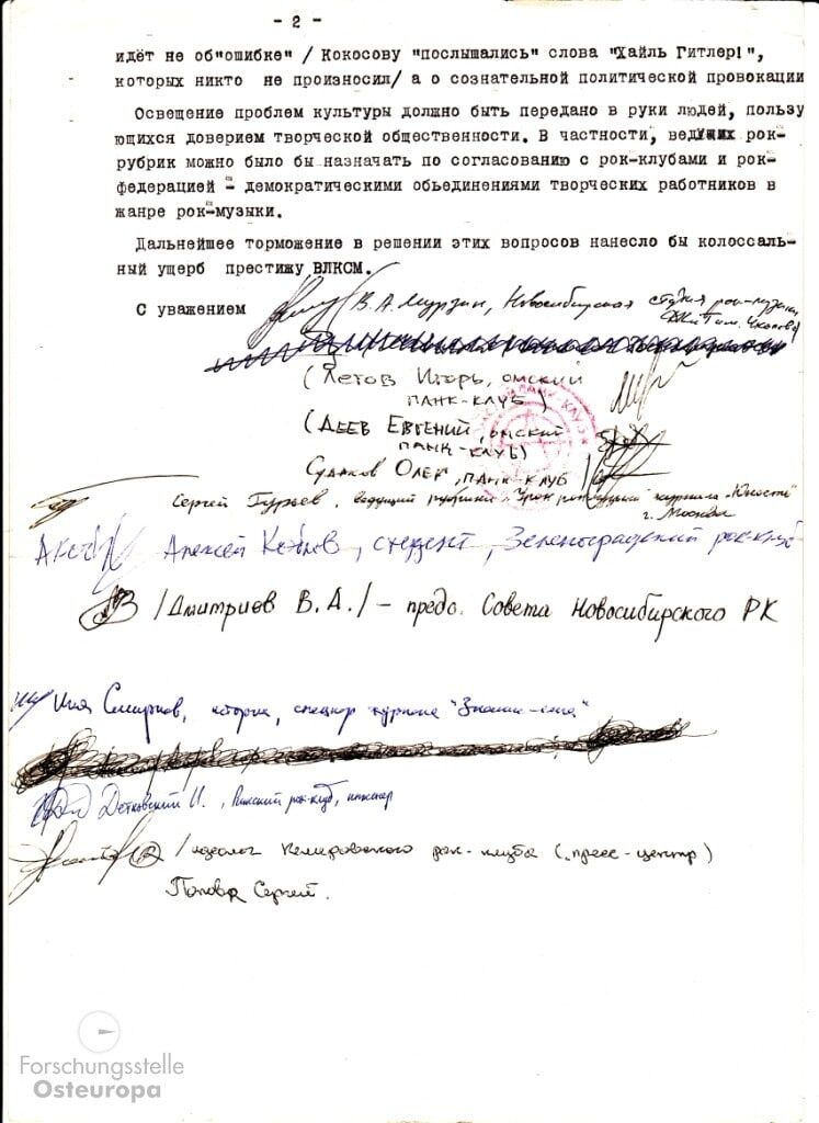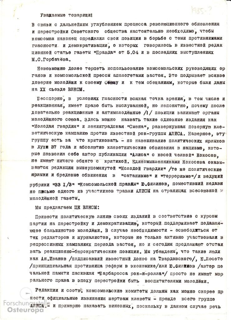 В этих условиях, представители рок-клубов СССР и дружественные журналисты составляют письмо в ЦК ВЛКСМ. Возмущенные музыканты обращаются к комсомольским боссам на их же языке: "В связи с дальнейшим углублением процесса революционного обновления и перестройки Советского общества ... необходимо, чтобы комсомол наконец определил свои позиции в борьбе с ... противниками гласности и демократизации". Читать это с серьезным видом сейчас нелегко, но подписи музыкантов "Гражданской обороны" под красной печатью Омского панк-клуба – это музейный экспонат! Как верно заметил классик, "Прожектор Перестройки" освещает Перестройку...»