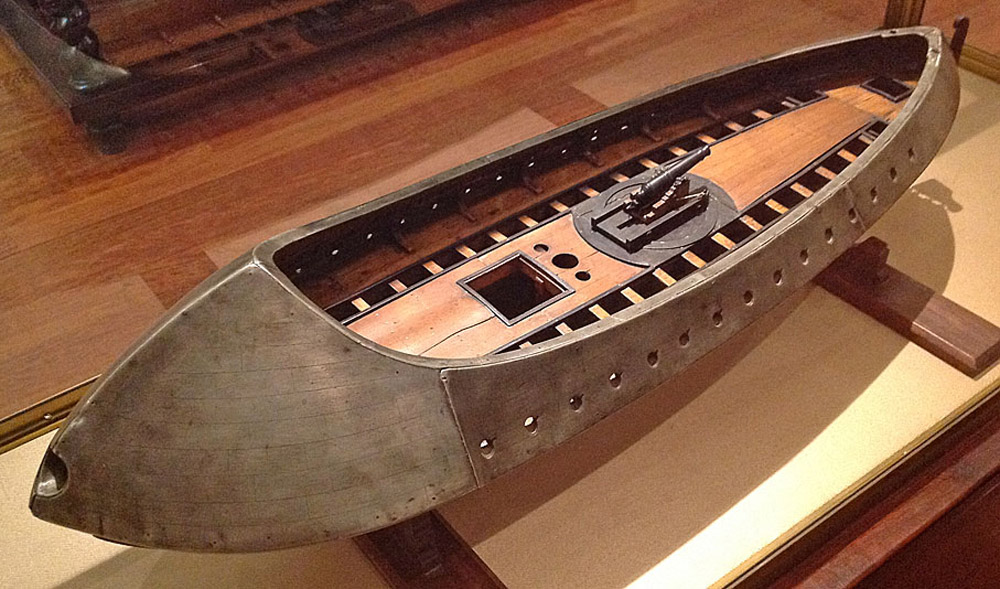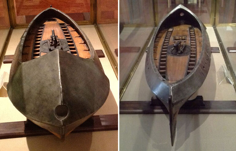Надводные борта судна были обшиты железными листами. Интересно, что его создатель понимал значение наклонной установки брони, способствующей рикошетированию ядер и пуль. Отверстия в палубе между пушкой и квадратным трюмным люком, возможно, говорит о том, что помимо весел предусматривалась установка мачты с парусом.
