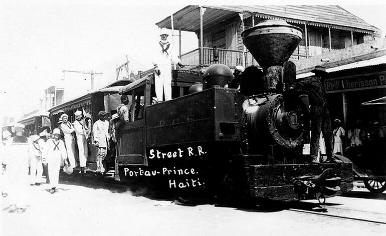 Американские моряки на паровом трамвае Порт-о-Пренса. Такие трамваи ходили на Гаити до начала 1950-х годов.