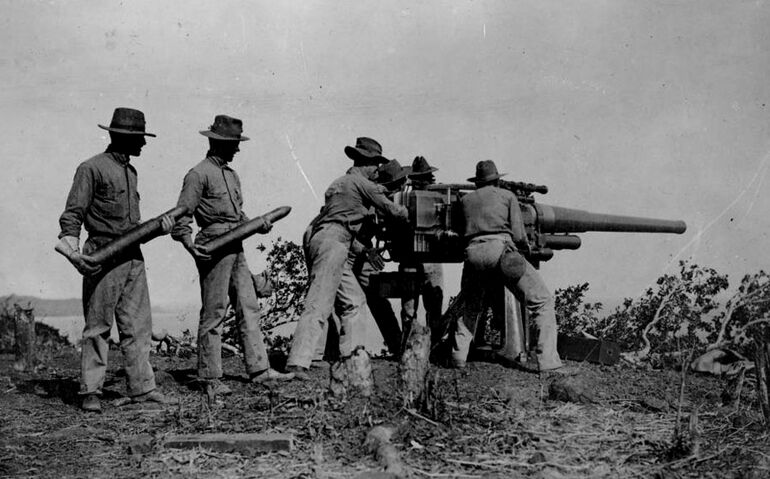 Американские артиллеристы ведут огонь из установленного на берегу морского орудия по гаитянским партизанам.