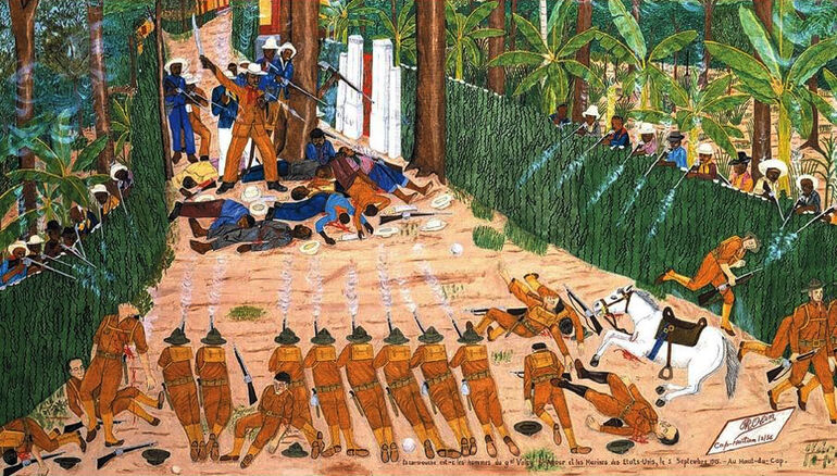 Картина современного гаитянского художника-примитивиста, изображающая партизанскую засаду на американских морпехов. Впрочем, автор, скорее всего, сильно приукрасил успехи повстанцев, так как за всю 19-летнюю гаитянскую эпопею морская пехота США, согласно официальным данным, потеряла на острове всего 10 человек убитыми, 26 — ранеными и 172 — умершими от колдовства болезней и несчастных случаев.
