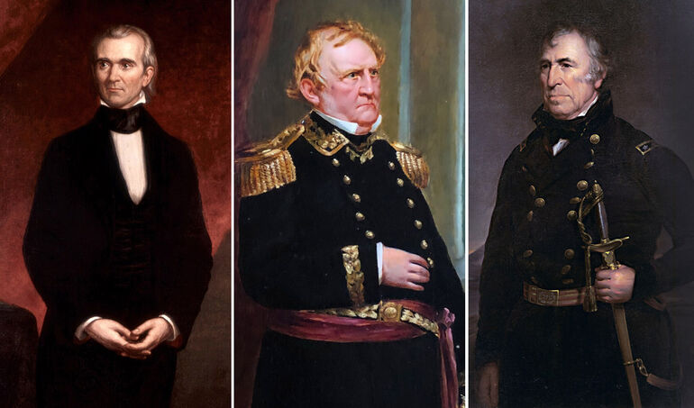 Главные действующие лица американской агрессии против Мексики: президент США Джеймс Полк, главнокомандующий армии США м 1841 по 1861 год — генерал Уифрид Скотт и главнокомандующий американской армией в Мексике — генерал Захарий Тейлор.