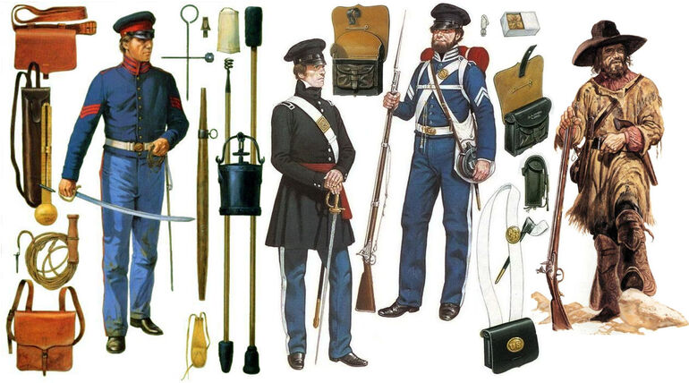 Старший сержант артиллерии и принадежности для обслуживания пушек; лейтенант линейной пехоты со шпагой; сержант линейной пехоты с капсюльным ружьем и патронная сумка пехотинца с перевязью и креплением для штыка; техасский рейнджер с кремневым мушкетом.