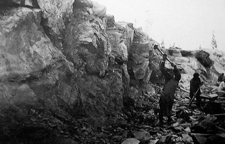 Типовой метод дробления гранита каналоармейцами при помощи кувалды и зубила.