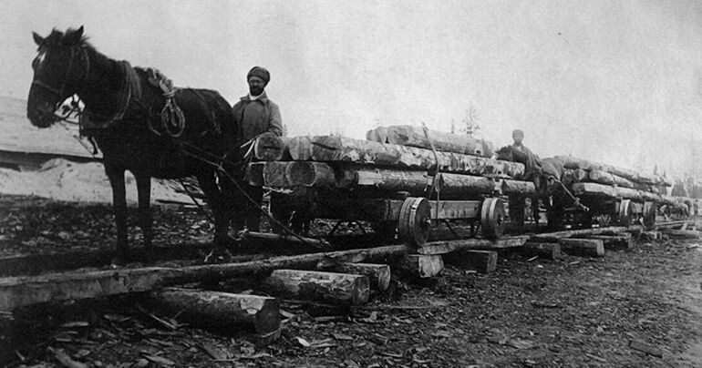 Конная "железная дорога" с деревянными рельсами и колесами, сооруженная по проекту заключенных Совковича и Педана. Местные остряки прозвали ее "лагерным Фордом". На стройке Беломорканала вообще почти всё было сделано из дерева.