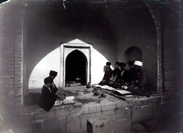 Эриван. Персы, читающие Коран у входа в мечеть