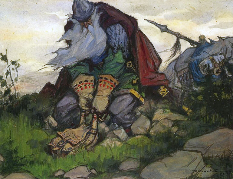 На заставке — сказочный Святогор тужится поднять неподъемную сумку, картина Ивана Симакова.