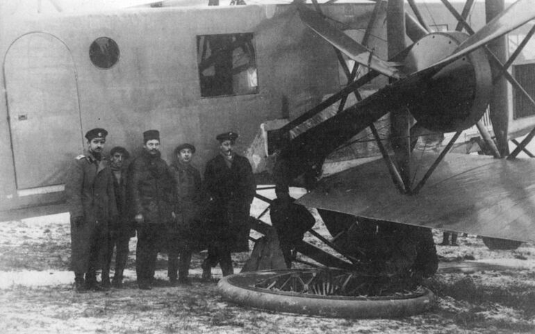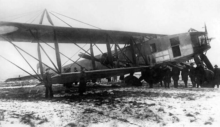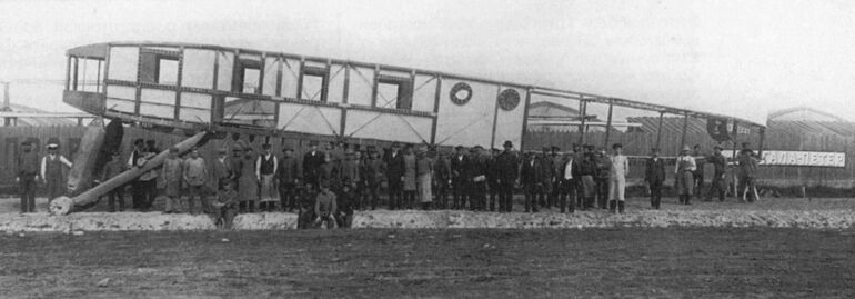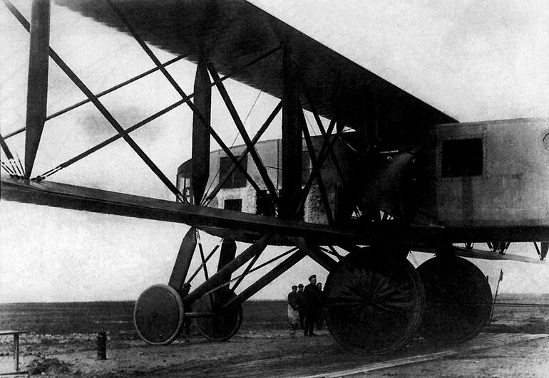"Святогор" на Комендантском аэродроме Петрограда летом 1916 года. Обратите внимание, что шкивы и втулки винтов закрыты каплевидными обтекателями. Вообще, в плане аэродинамики "Святогор" выглядел неплохо на фоне современников. Но, к сожалению, этого оказалось недостаточно, чтобы преодолеть нехватку энергии.