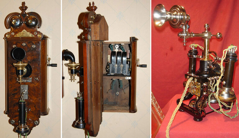 Слева и в центре — первый настенный телефонный аппарат знаменитой шведской фирмы "Эриксон", выпущеный в 1881 году. Эта модель производилась в течение пяти лет. Пустой нижний отсек на центральном снимке предназначался для аккумуляторной батареи.