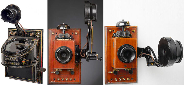 Слева — первый в мире телефон для громкой связи, спроектированный Томасом Эдисоном в 1879 году. Круглая стеклянная пластина на крышке корпуса - мембрана динамика. В центре и справа - также разработанная Эдисоном первая в мире компактная модель телефона с угольным микрофоном в корпусе и наушником на поворотном кронштейне. Аппарат выпускался с 1878 года.
