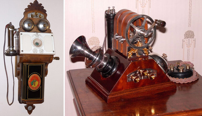 Слева — первый российский телефон, который выпускался в 1882-88 годах на гельсингфорском заводе "Ваденс Электриска Аффар", основанном финским инженером и предпринимателем шведского происхождения Даниэлем Йохансом Ваденом.Интересно, что микрофонная панель сделана из белого мрамора. Черный контейнер снизу — съемный аккумулятор. Данный аппарат имеет заводской порядковый номер 1146, говорящий о том, что производство было крупносерийным. Справа — первый настольный телефон той же фирмы, предположительно выпущенный во второй половине 1880-х годов.