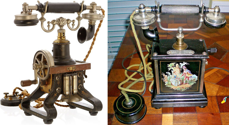 Справа — первый переносной настольный аппарат той же фирмы образца 1885 года. Он оснащен двумя слуховыми трубками, чтобы по нему могли одновременно говорить два человека.