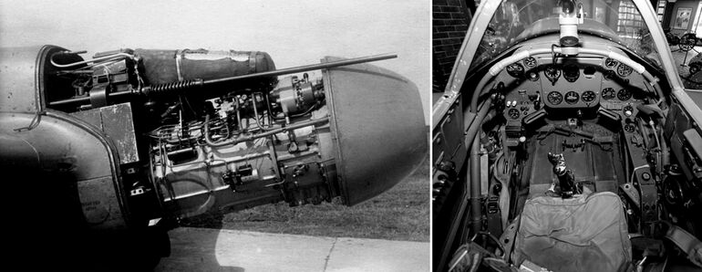 Передняя часть однопушечного Як-15 со снятым капотом и интерьер кабины пилота.