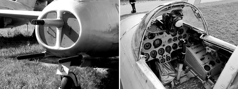 Слева — "артбатарея" МиГ-9: 37-миллиметровая пушка Н-37 и две 23-миллиметровых НС-23. Справа - кабина пилота.