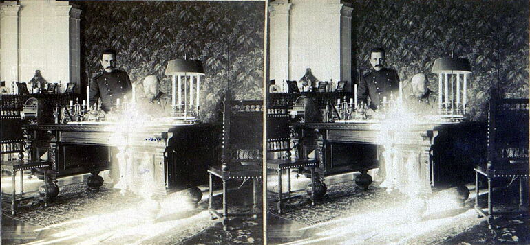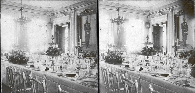 1900. Интерьер столовой - в центре накрытый стол, у стола стулья