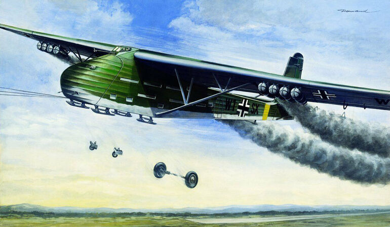 Только этот монстр или четырехмоторный "Юнкерс-90" могли в одиночку оторвать от земли полностью загруженный Ме-321. Но даже с ними длина разбега была чрезмерной, а чтобы ее сократить планер оснащали восемью твердотопливными стартовыми ракетными ускорителями, которые сбрасывались после взлета и спускались на парашютах. Также сбрасывались колеса шасси, а посадка производилась на лыжи.